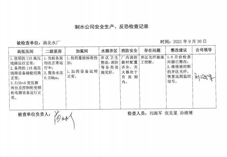 渦北水廠2021年9月安全生產(chǎn)檢查記錄