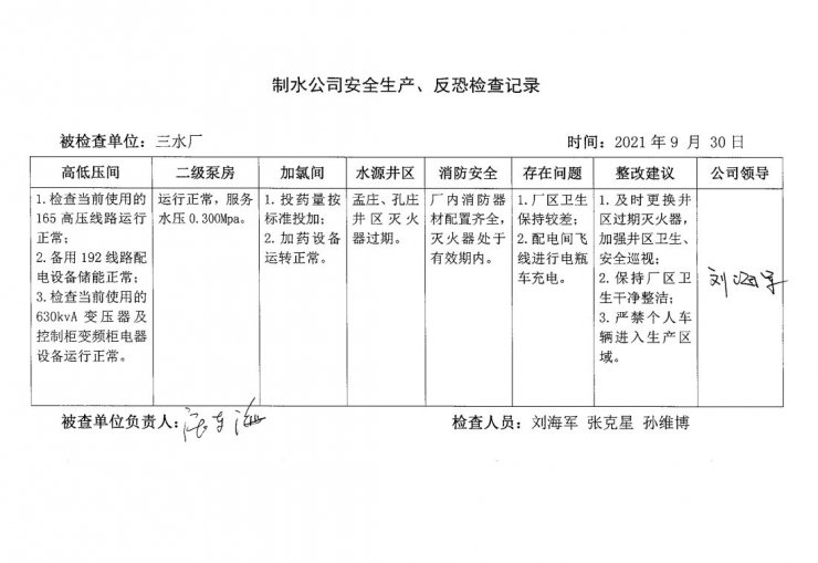 三水廠2021年9月安全生產(chǎn)檢查記錄