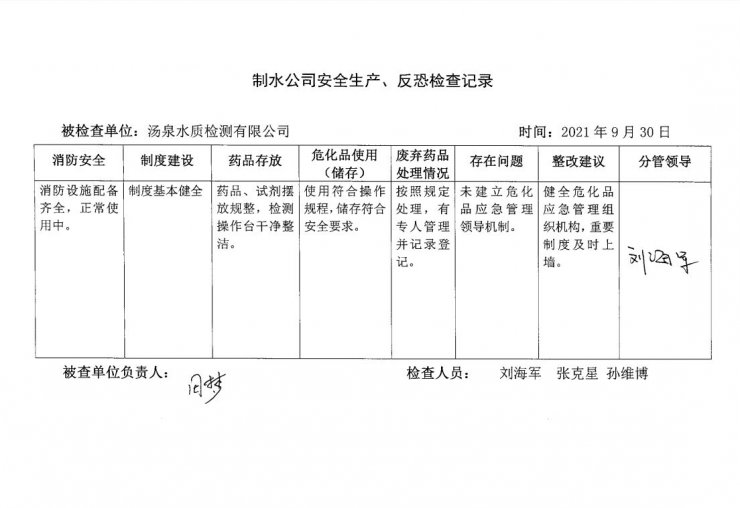 湯泉水質(zhì)檢測中心2021年9月安全生產(chǎn)檢查記錄