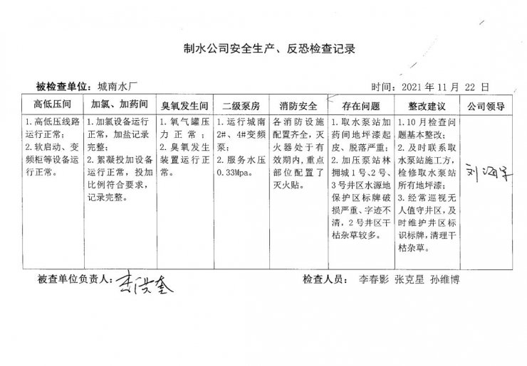 城南水廠2021年11月安全生產(chǎn)檢查記錄