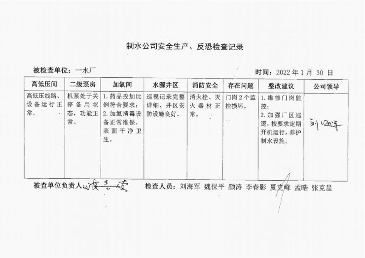一水廠2022年1月安全生產(chǎn)檢查記錄