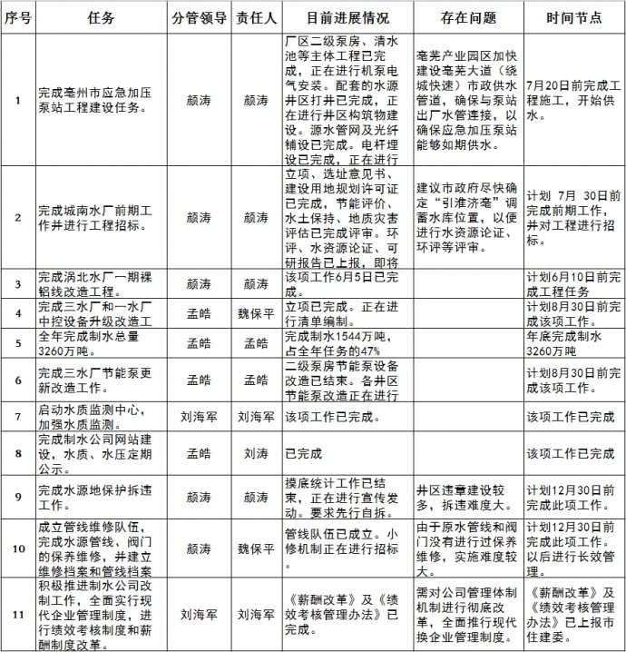 2016年6月份市制水公司崗位目標任務(wù)分解